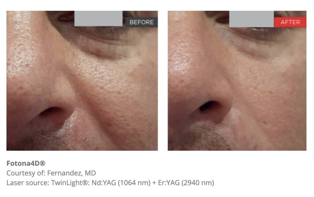 The Fotona 4D facelift is amazing because it combines 4 different laser treatments into an hour in office procedure that thickens the entire dermis with the first 3 steps. Step 4 Resurfaces the epidermis. We do not talk about resurfacing enough.  Resurfacing is equivalent to sanding furniture so that you are leveling out scratches and dents, improving texture and pigment. This amazing 4D Fotona facelift means that every level of your skin gets treated with every session.